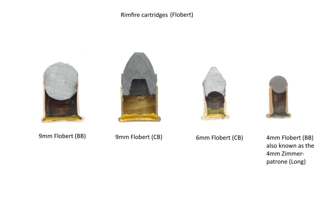 The most common caliber in classic target pistols is the .22 Long Rifle (LR) or 5.6×15R (metric) cartridge. In some cases calibers up to 11 mm are found as well. Although many other calibers were used, a lot depended on the availability and cost of ammo for the shooter. The .22 Long Rifle cartridge became readily available and (still is!) relatively affordable to shoot. The cartridge is consistent in performance and allows the shooter to fire their pistol more often while practicing. While the early target pistols had hand-loaded flintlock systems, the development of better chemicals led to the introduction of percussion pistols which in turn led to the development of early rimfire and later centrefire cartridges. In 1845-49 the Frenchman named Louis A. FLOBERT introduced his invention: the Flobert cartridge, which was basically a percussion cap with a small round lead pellet mounted on it. By making a rim to the cartridge, it formed to basis for the modern rim fired cartridge. Flobert or (BB and CB’s) munitions are low powered cartridges which only use the explosive force of the ignition compound to power the pellet through the barrel. No powder charge is used. This type of ammunition did not produce a lot of smoke – in an era where black powder was the standard – and therefore was ideally suited for indoor shooting at targets up to a couple of yards. When indoor shooting became popular during the 1850-60’s, it caused many gunsmiths to design their own new systems. These type of classic target pistols became known as the ‘salon- or parlor pistol’ as they were often used in the living room of the home, using the fireplace as a bullet stop!